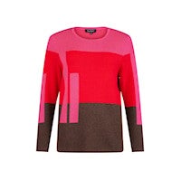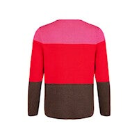 Gebreide rechte trui met vlak motief. In Rood,fuchsia en taupe.