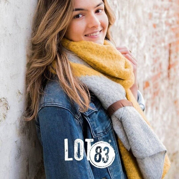 Ook op deze sjaal het leren detail, het kenmerk van LOT83.