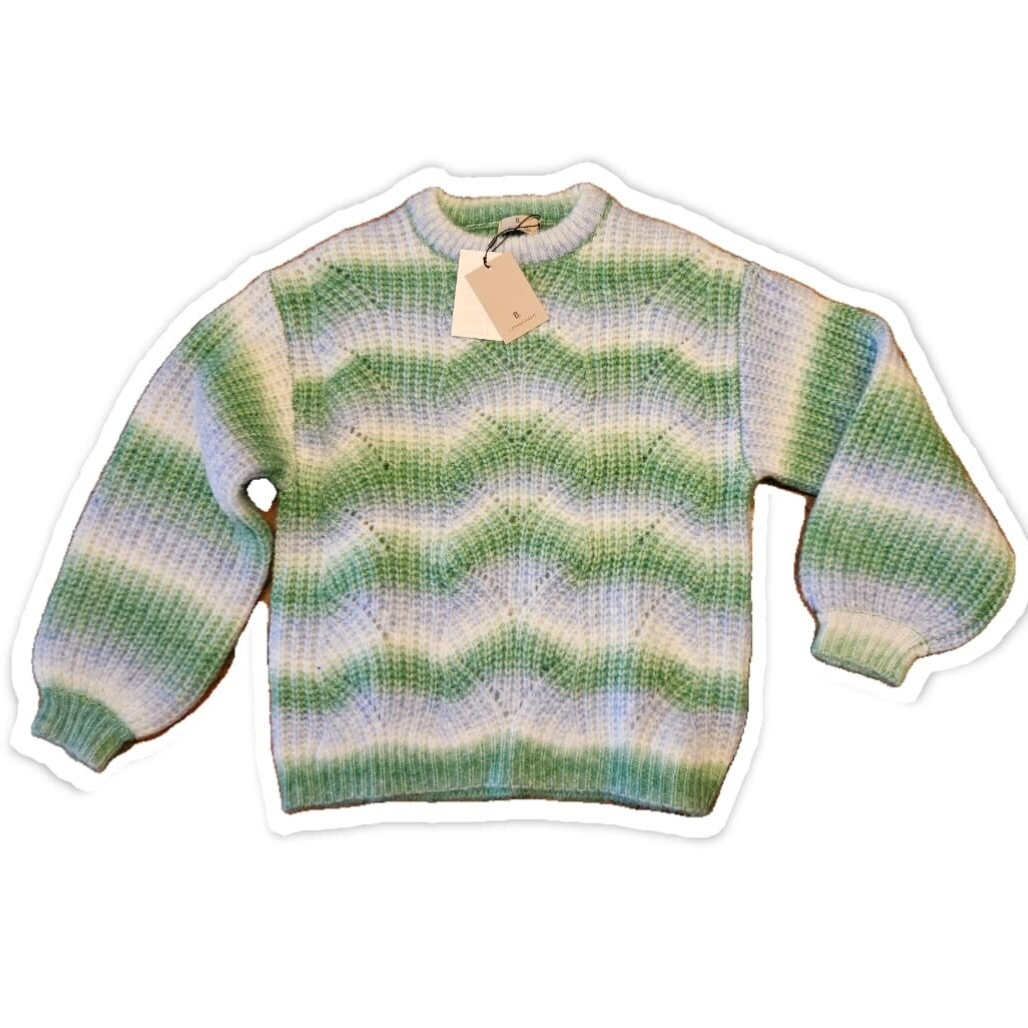 Heerlijke dikke trui in frisse kleuren; wit,groen en lichtblauw zigzag patroon.