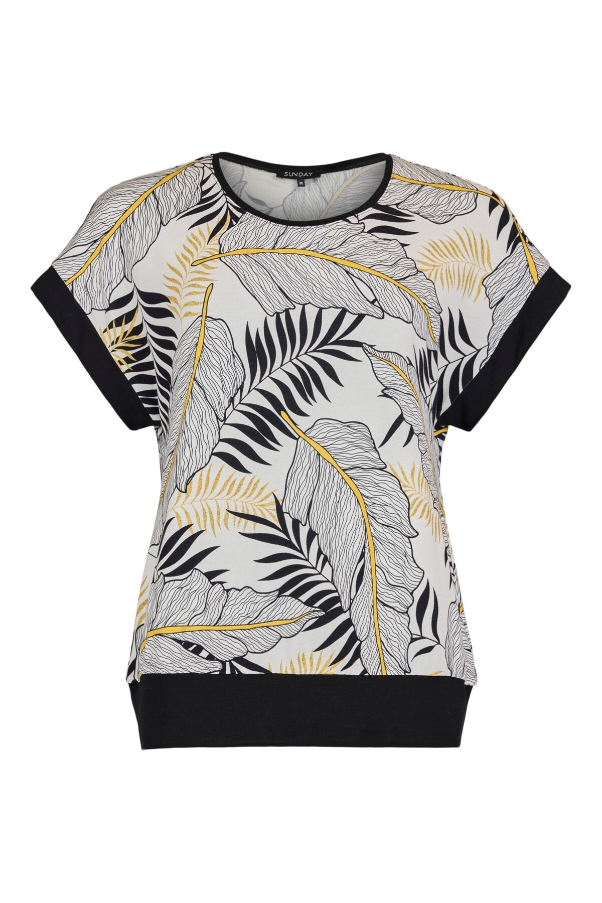 T-shirt met band en aangeknipt mouwtje in mooi blad patroon met zwart en geel.